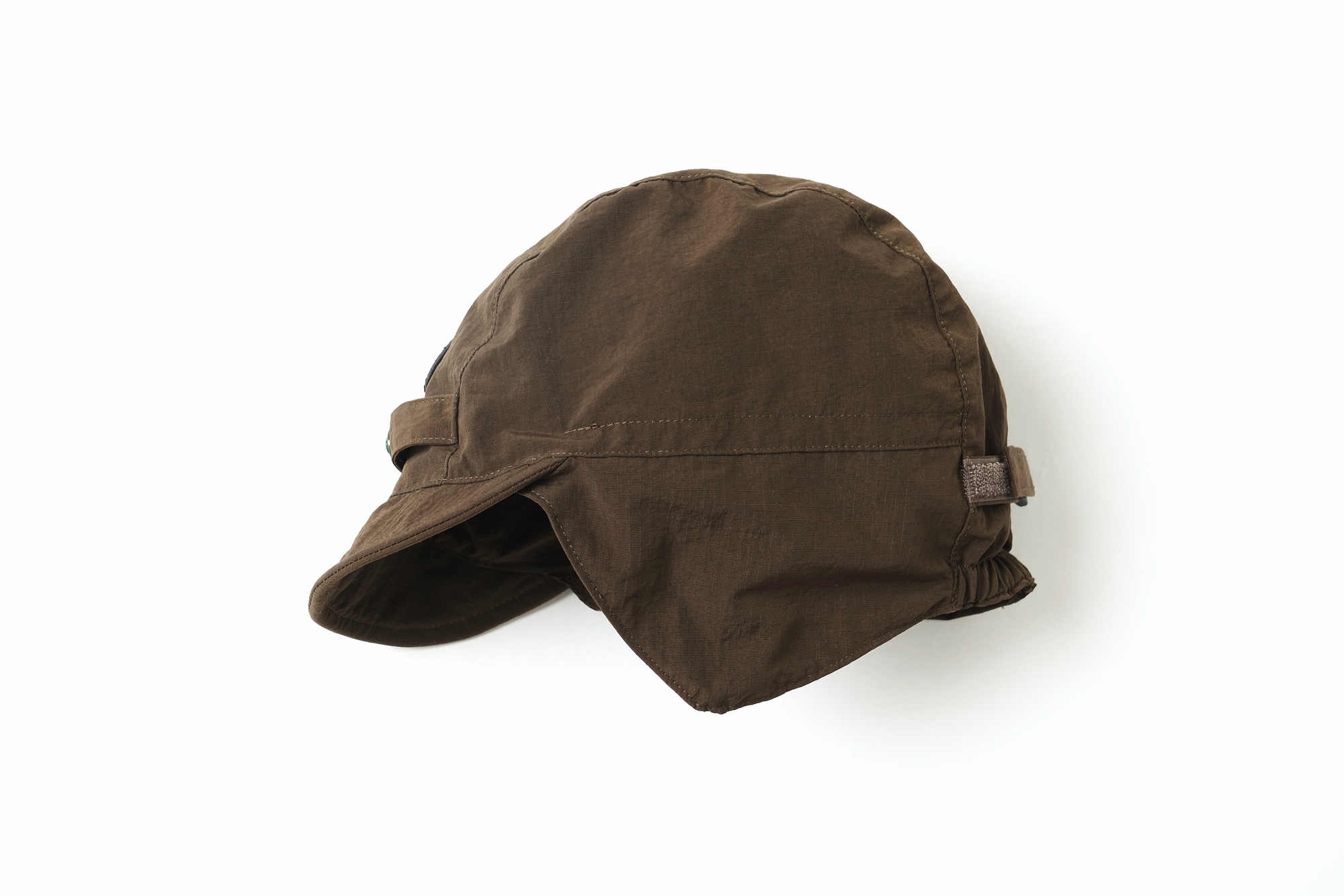塩縮加工の撥水ナイロン 100 にで構成した耳当て付きキャップ。