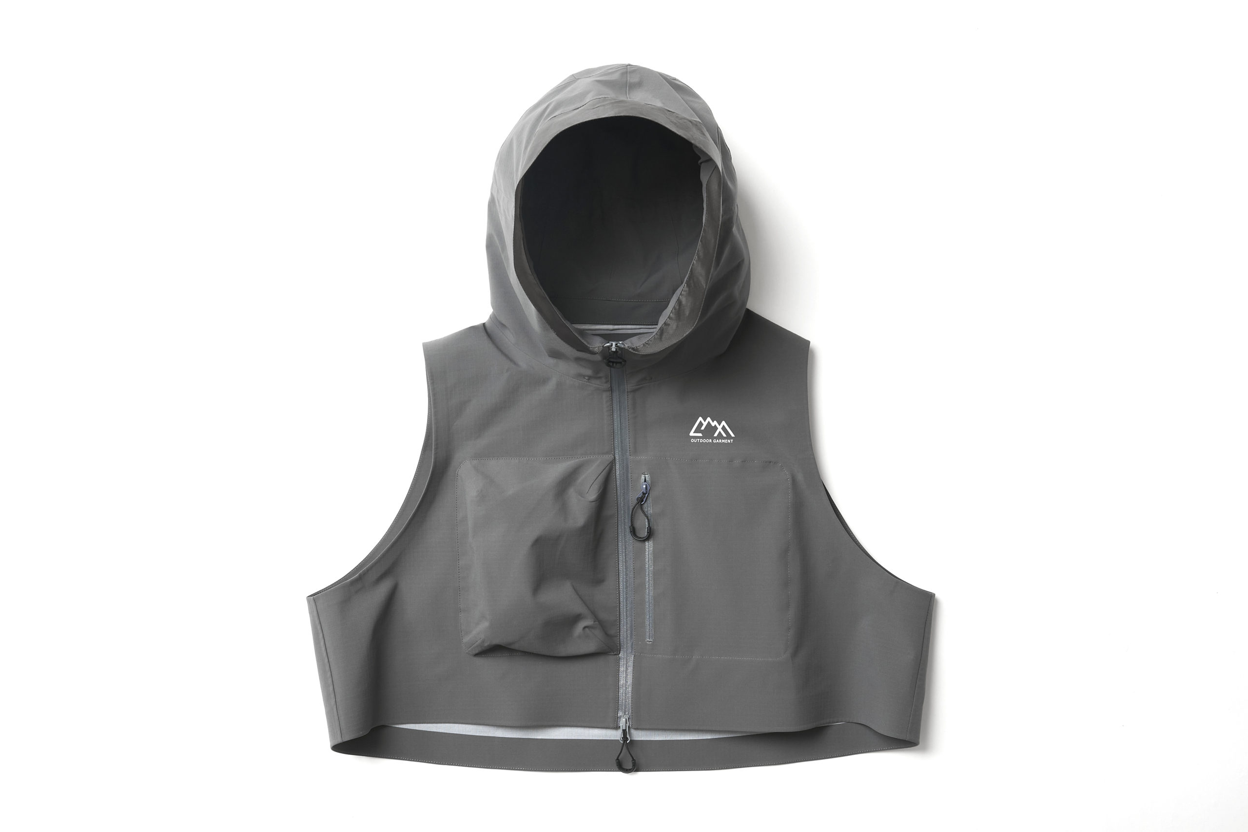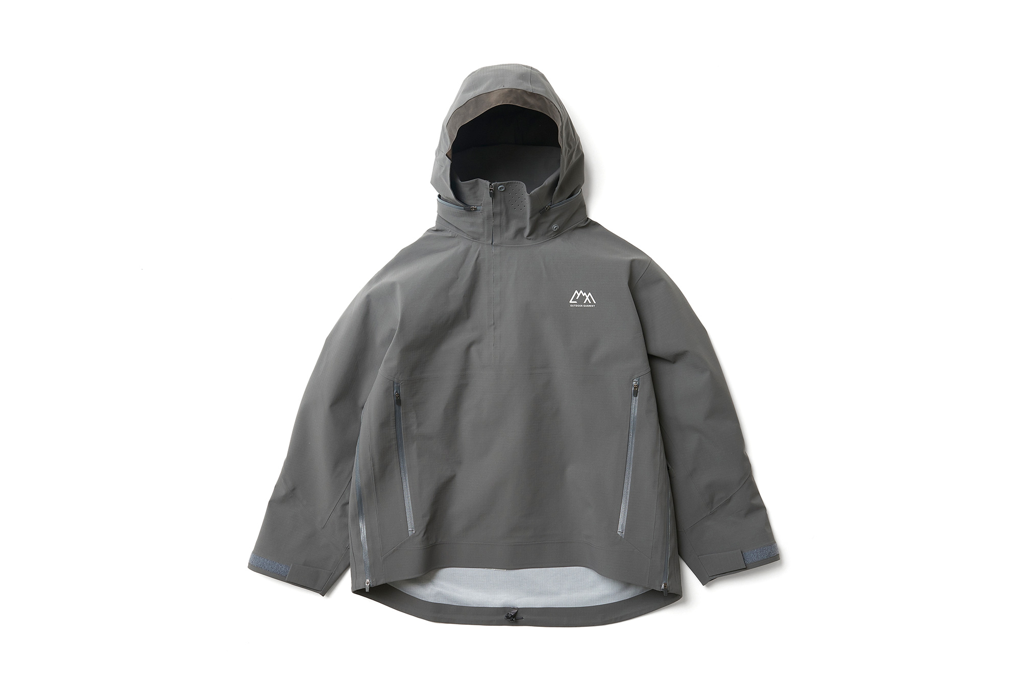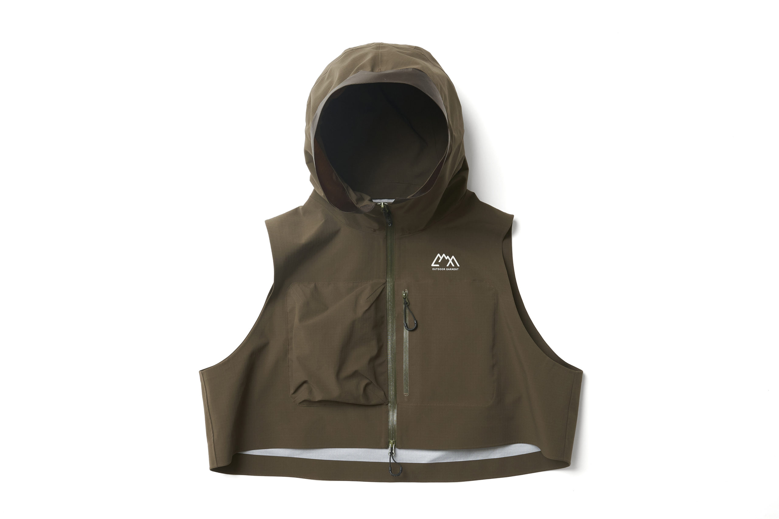 張りがありストレッチの特性を持った生地に変更。耐水 20000、透湿 20000 のフルシームシェル。前面に大きな小物を整理できるポケットを配した。右胸と左ポケットですぐ出したいもの、大事に持っておきたいものでディテールを変えてある。