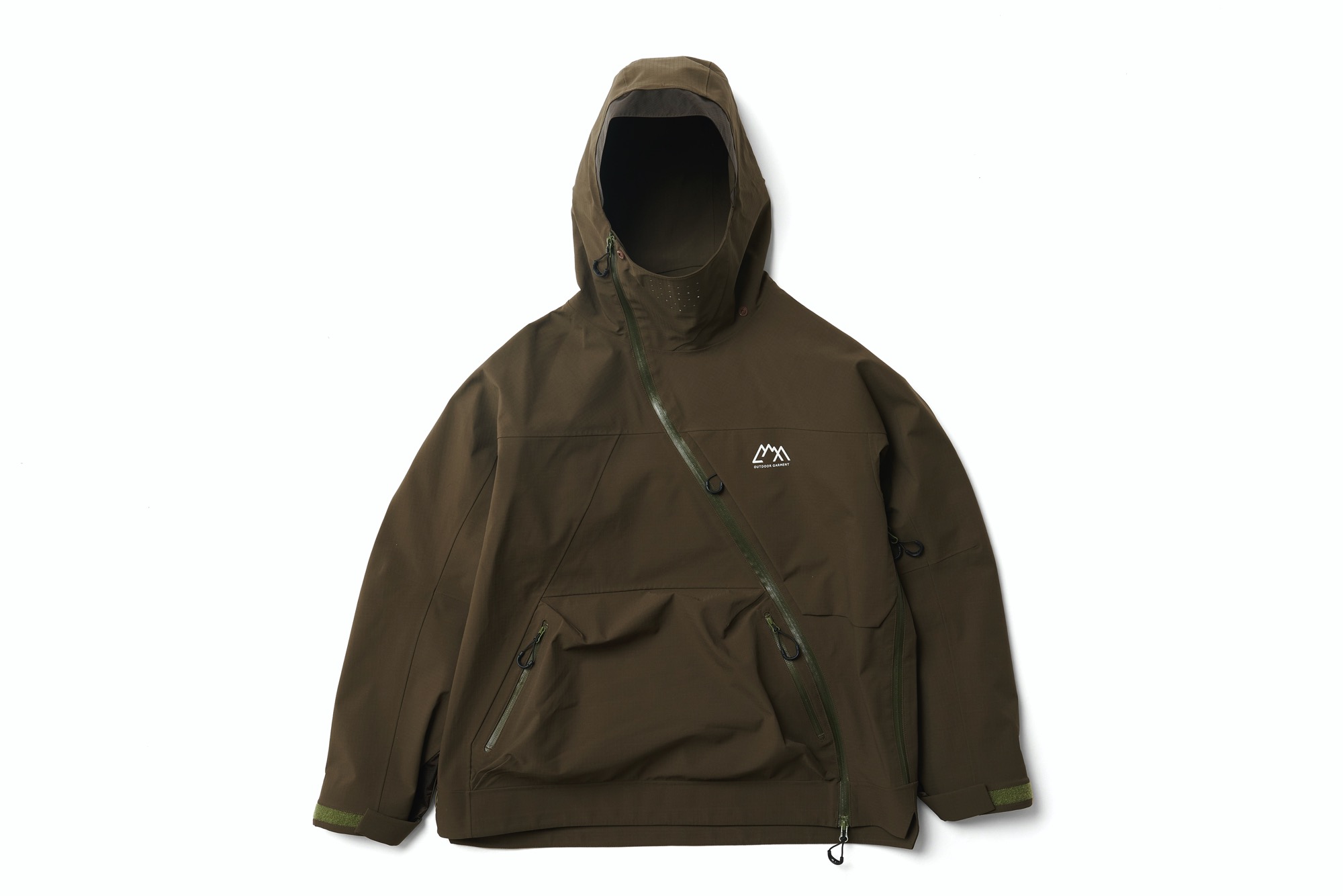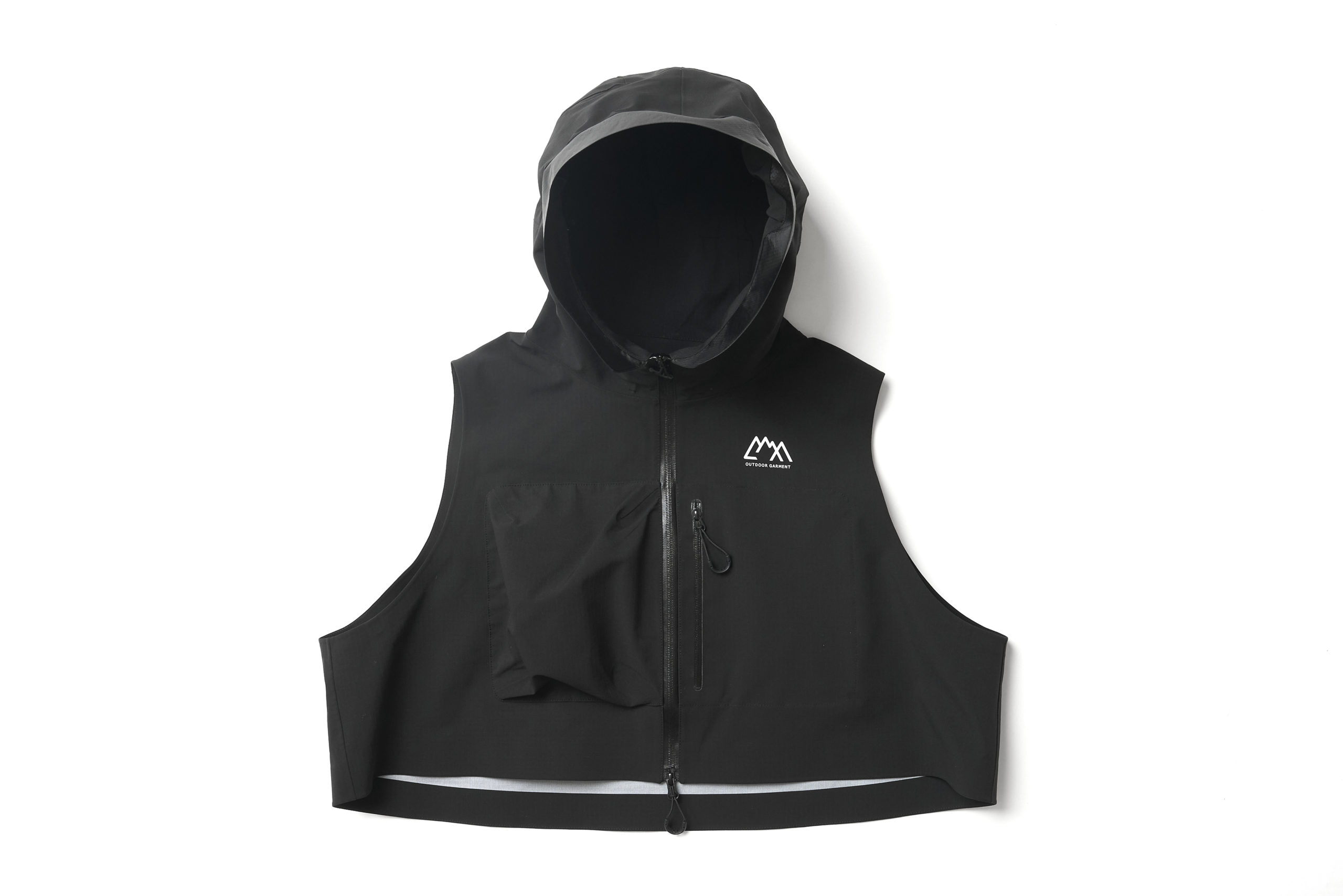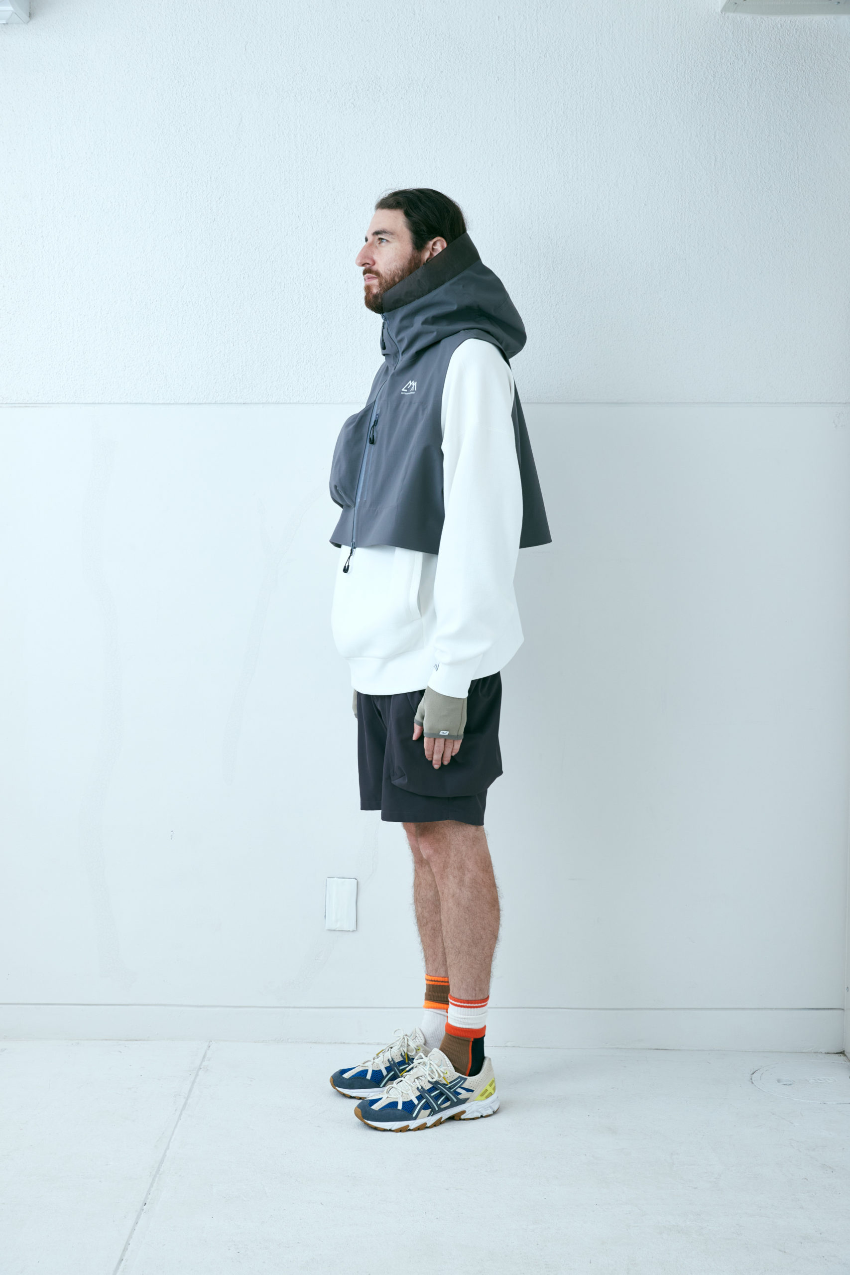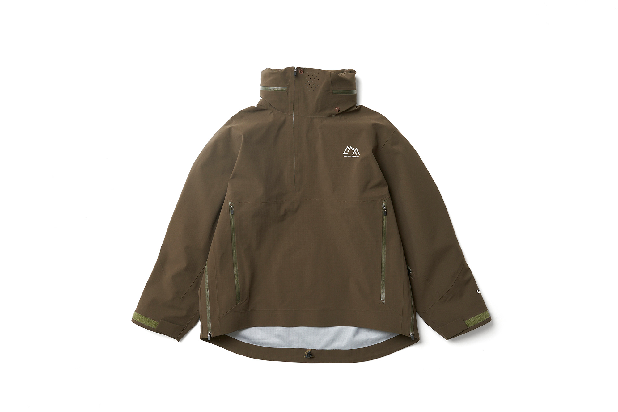 張りがありストレッチの特性を持った生地に変更。耐水 20000、透湿 20000 のフルシームシェル。前面に大きな小物を整理できるポケットを配した。右胸と左ポケットですぐ出したいもの、大事に持っておきたいものでディテールを変えてある。