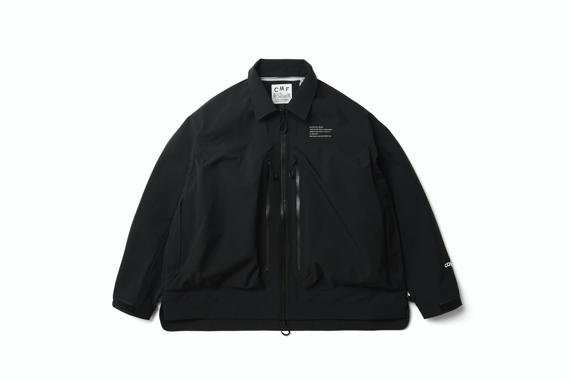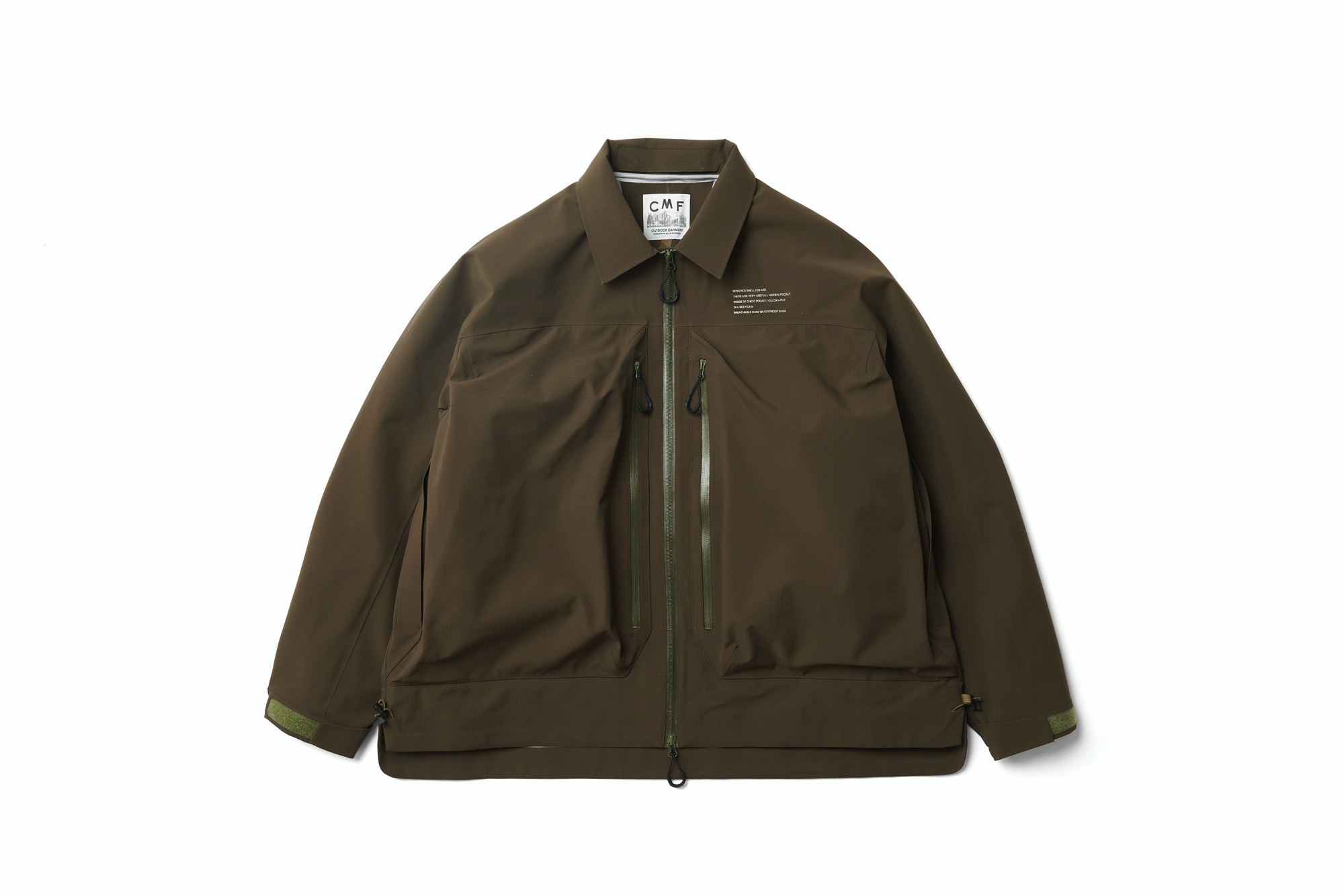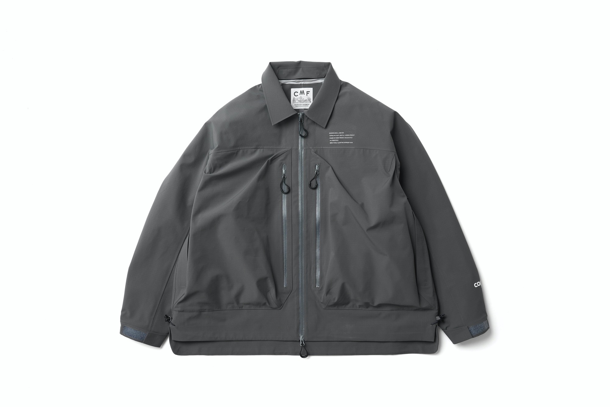 Coexist shell water proof 20000, breatable 20000. unique point will be front big pocket. There are many small pocket inside of this part. left side and right side will be different with quick pocket or important pocket. I change the detrails.