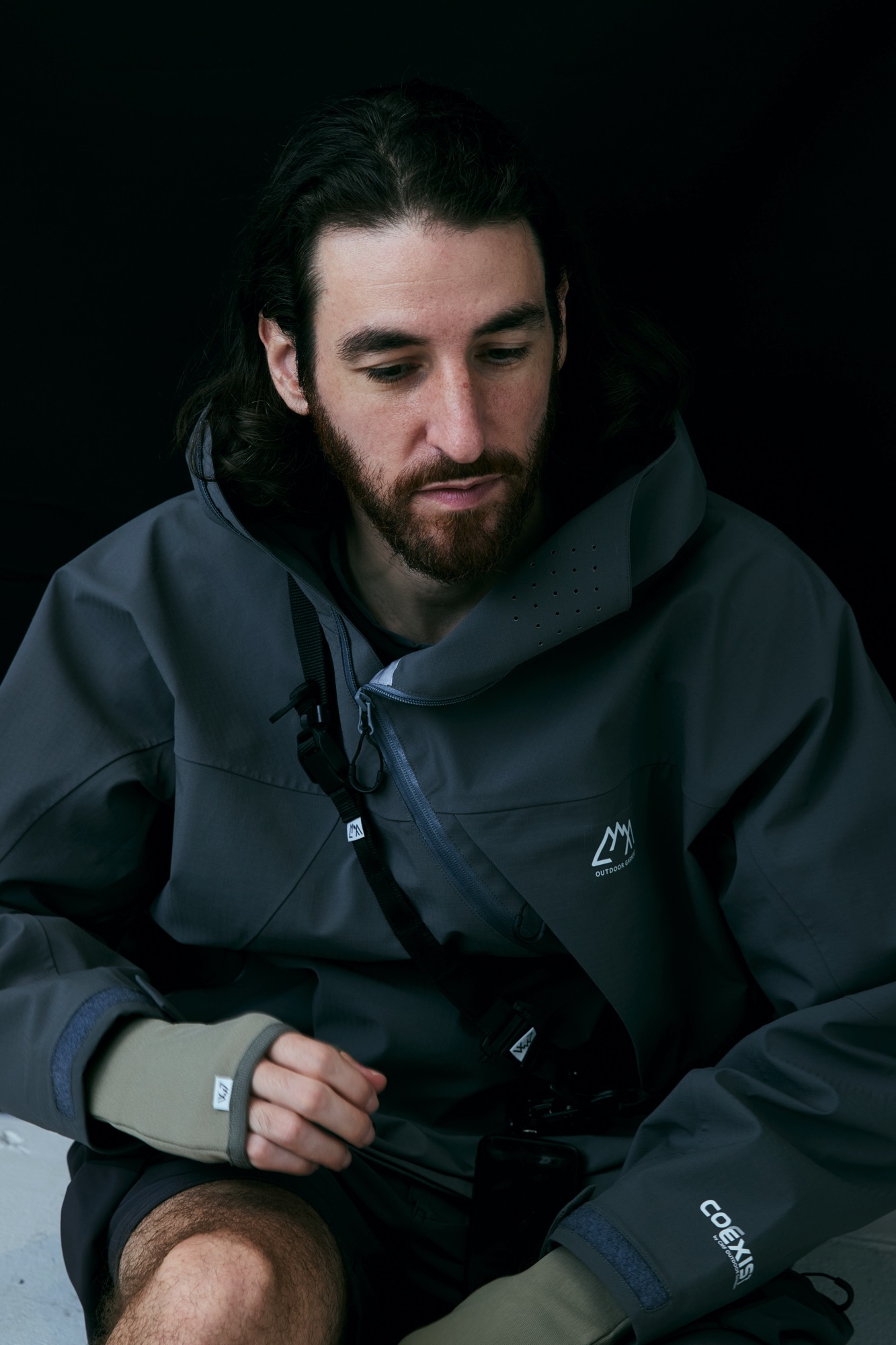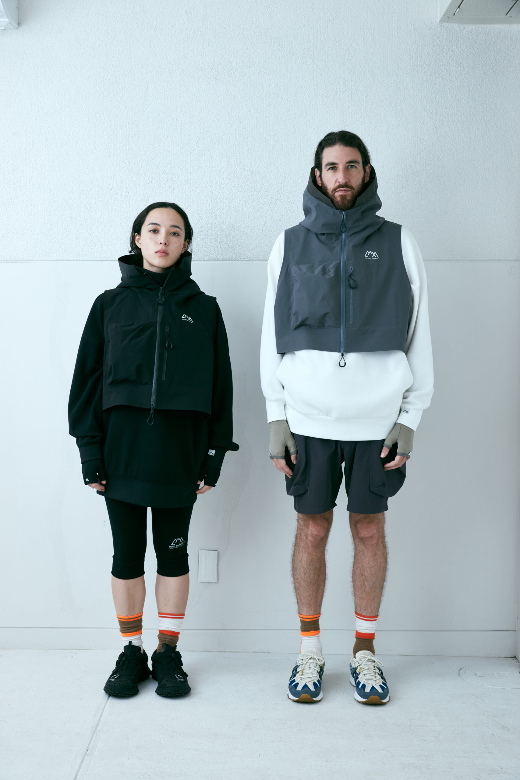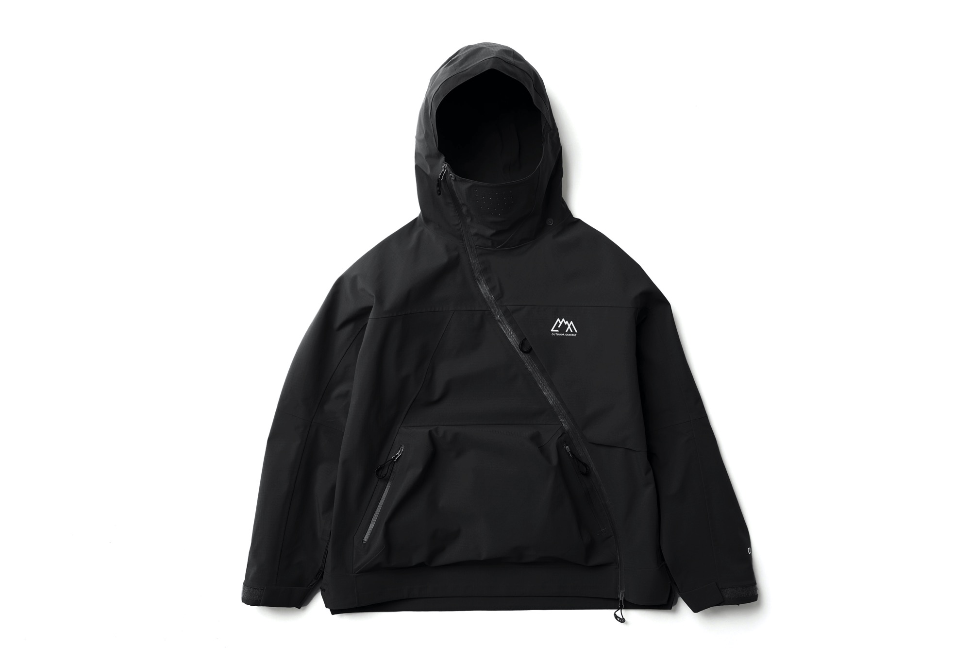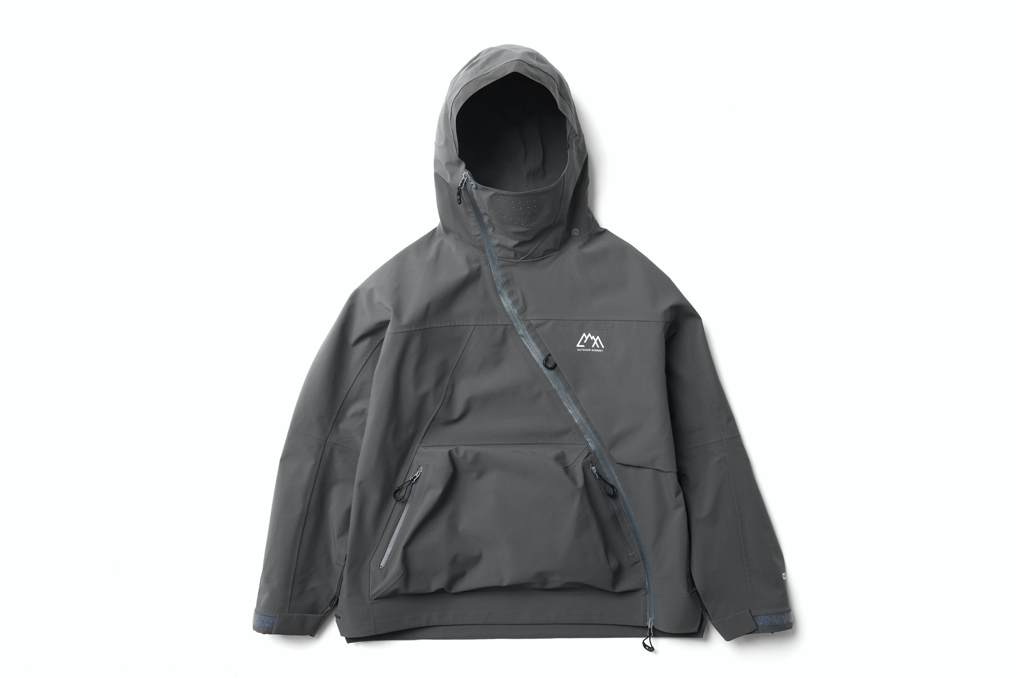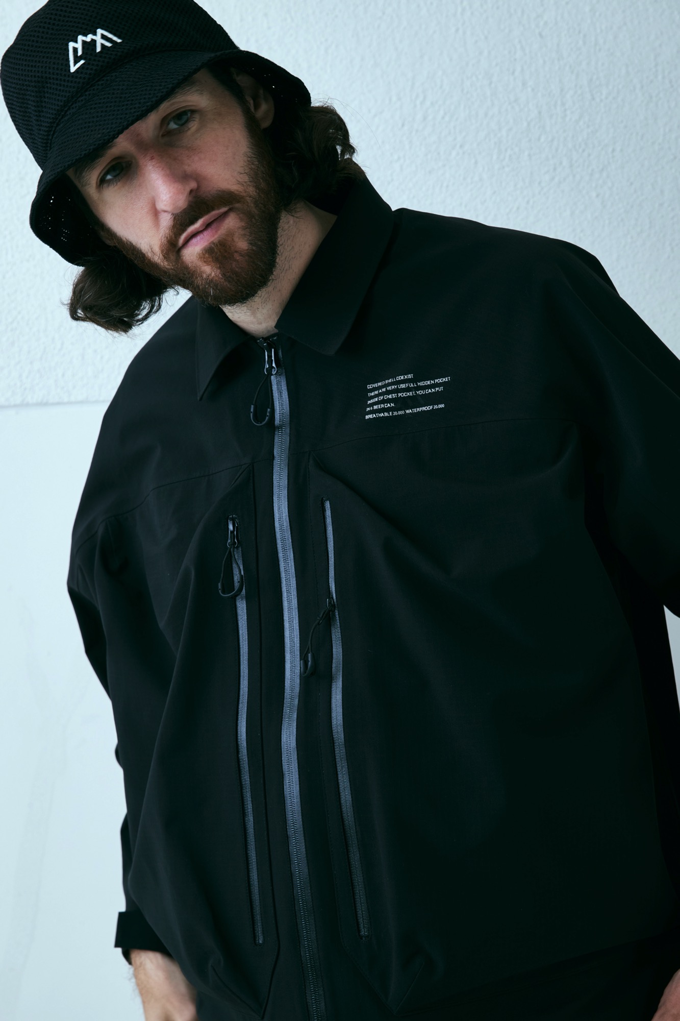 新開発生地であらたに作成した COEXIST 3 レイヤー耐水 20000 透湿 20000。フルシーム。プリントは全てリフレクタープリント。左右非対称な服を機能的にどう山と都市で使うか?をテーマにデザインしたこの型。 あごの下に来るジップの位置をずらし、フルジップで着用しながらその状態でどう内部の温度を排出するか、ゴーグル着用時の曇りに対応できるように製作。前期との違いは裾のジップエンドのパターンを変更し、スライダーの着脱がしやすいようにした。