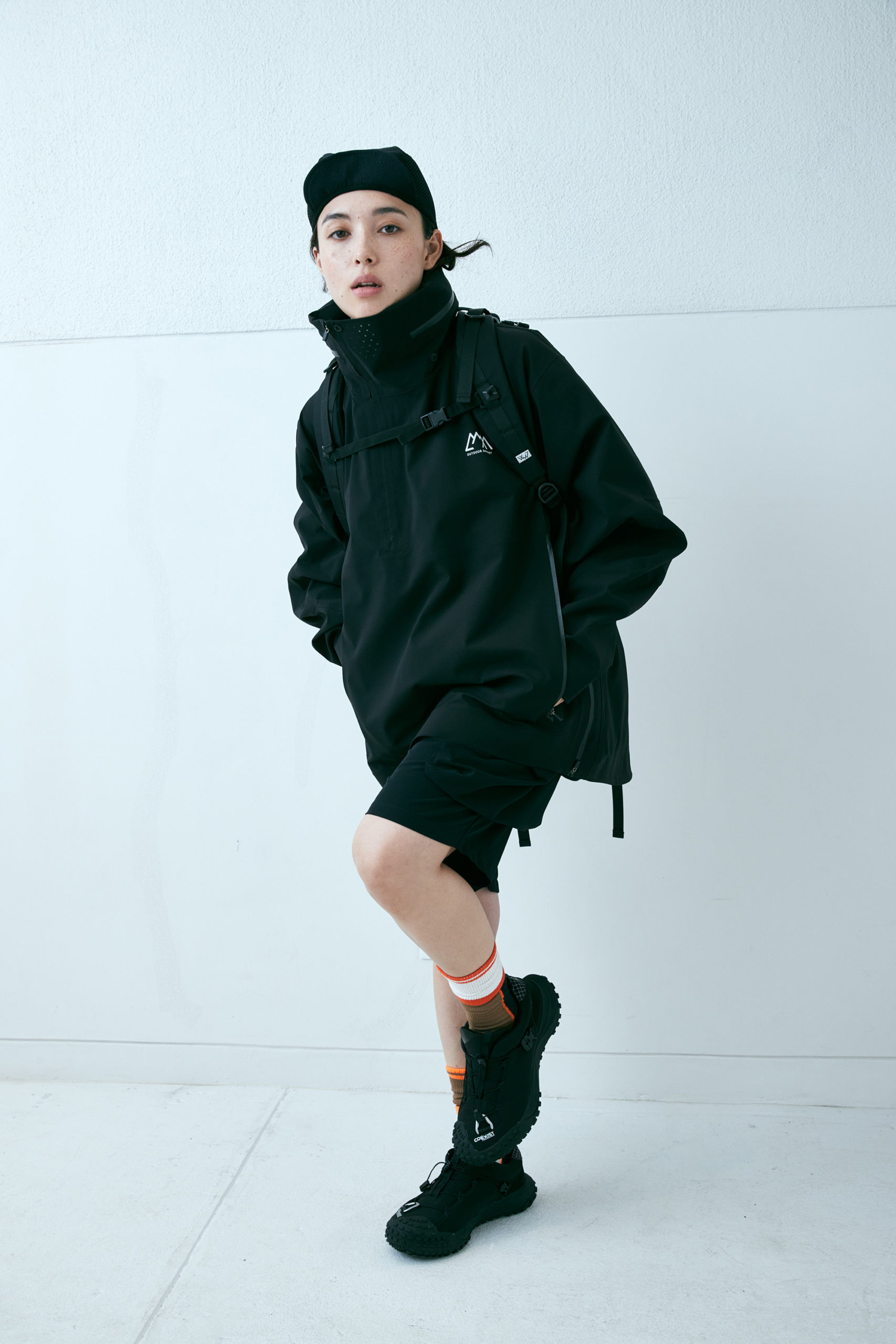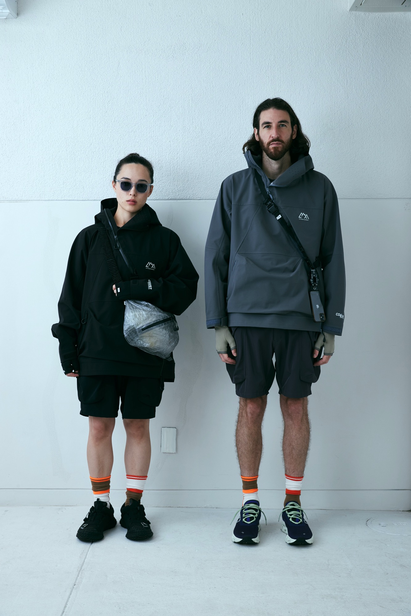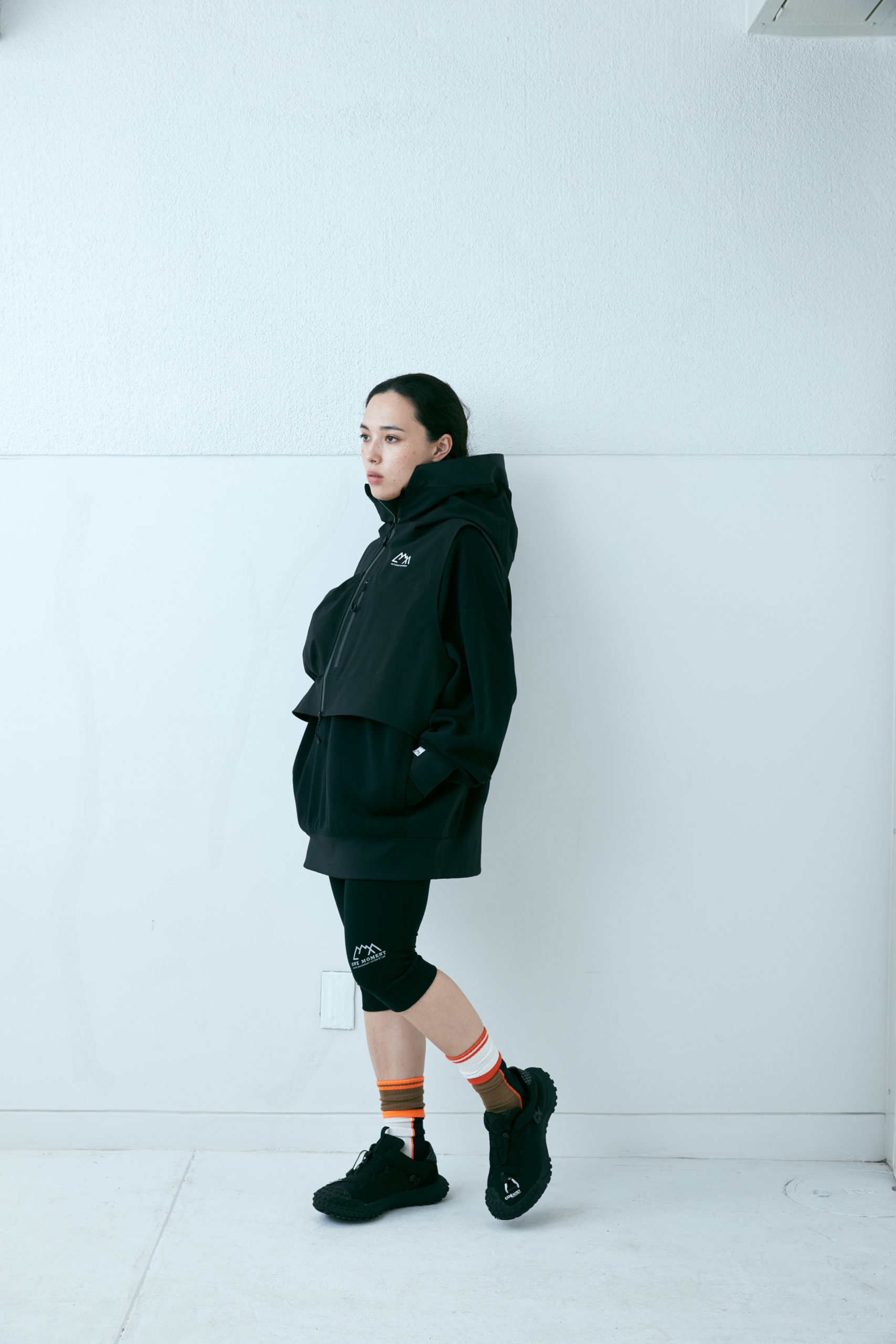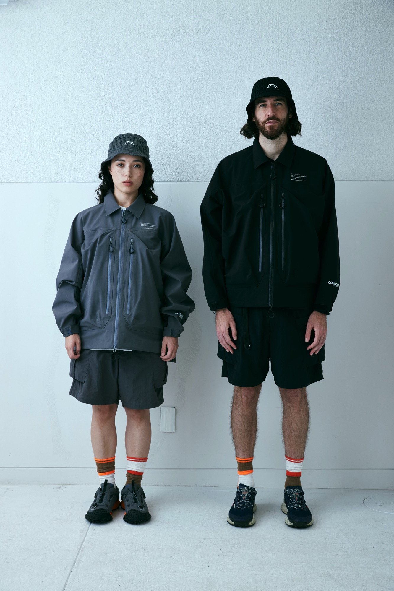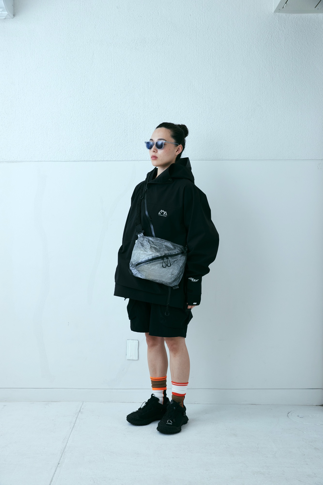 新開発生地であらたに作成した COEXIST 3 レイヤー耐水 20000 透湿 20000。フルシーム。プリントは全てリフレクタープリント。左右非対称な服を機能的にどう山と都市で使うか?をテーマにデザインしたこの型。 あごの下に来るジップの位置をずらし、フルジップで着用しながらその状態でどう内部の温度を排出するか、ゴーグル着用時の曇りに対応できるように製作。前期との違いは裾のジップエンドのパターンを変更し、スライダーの着脱がしやすいようにした。