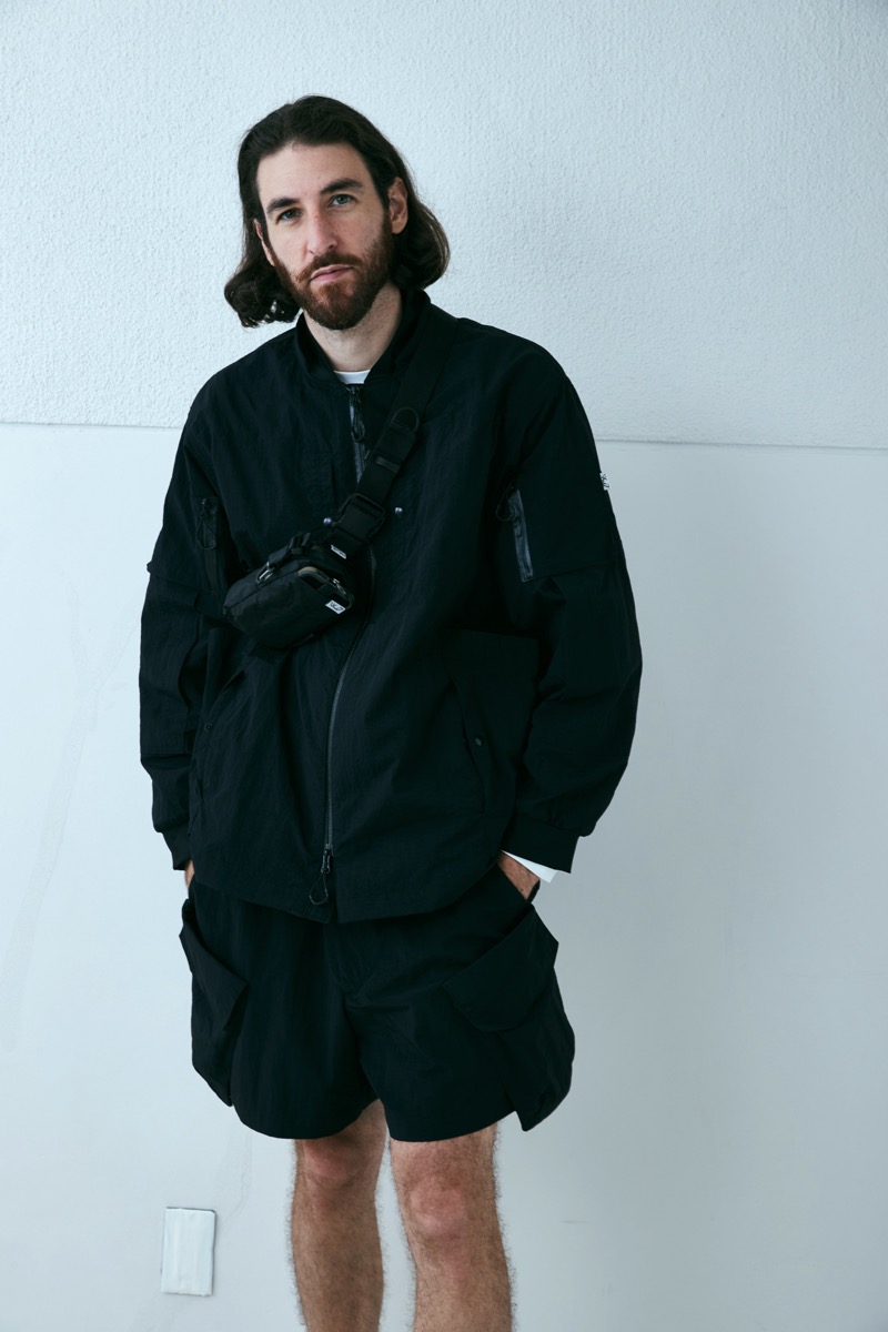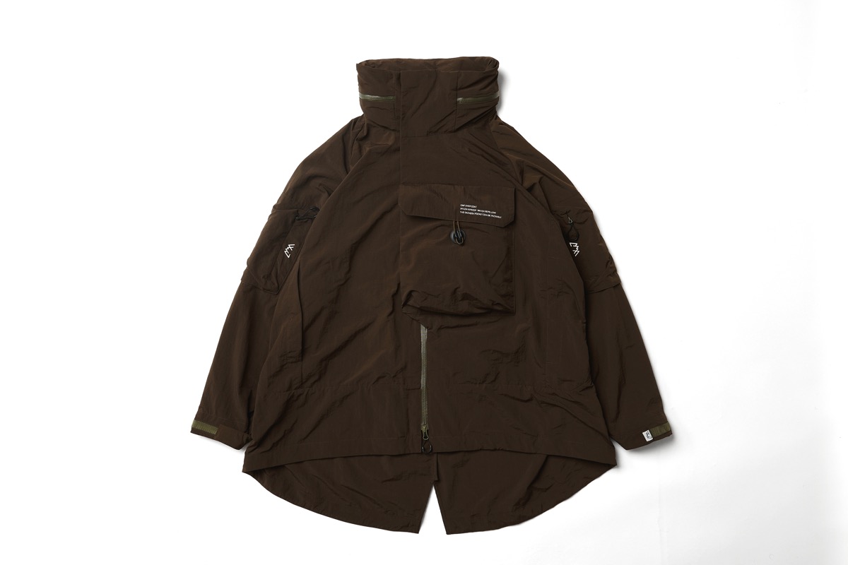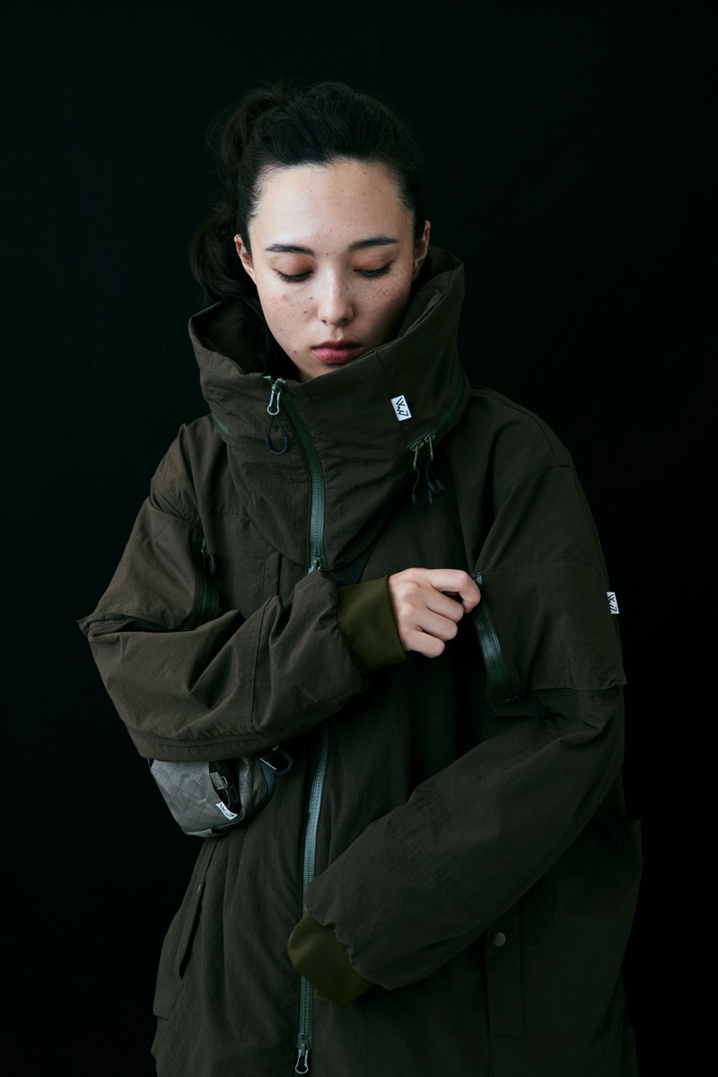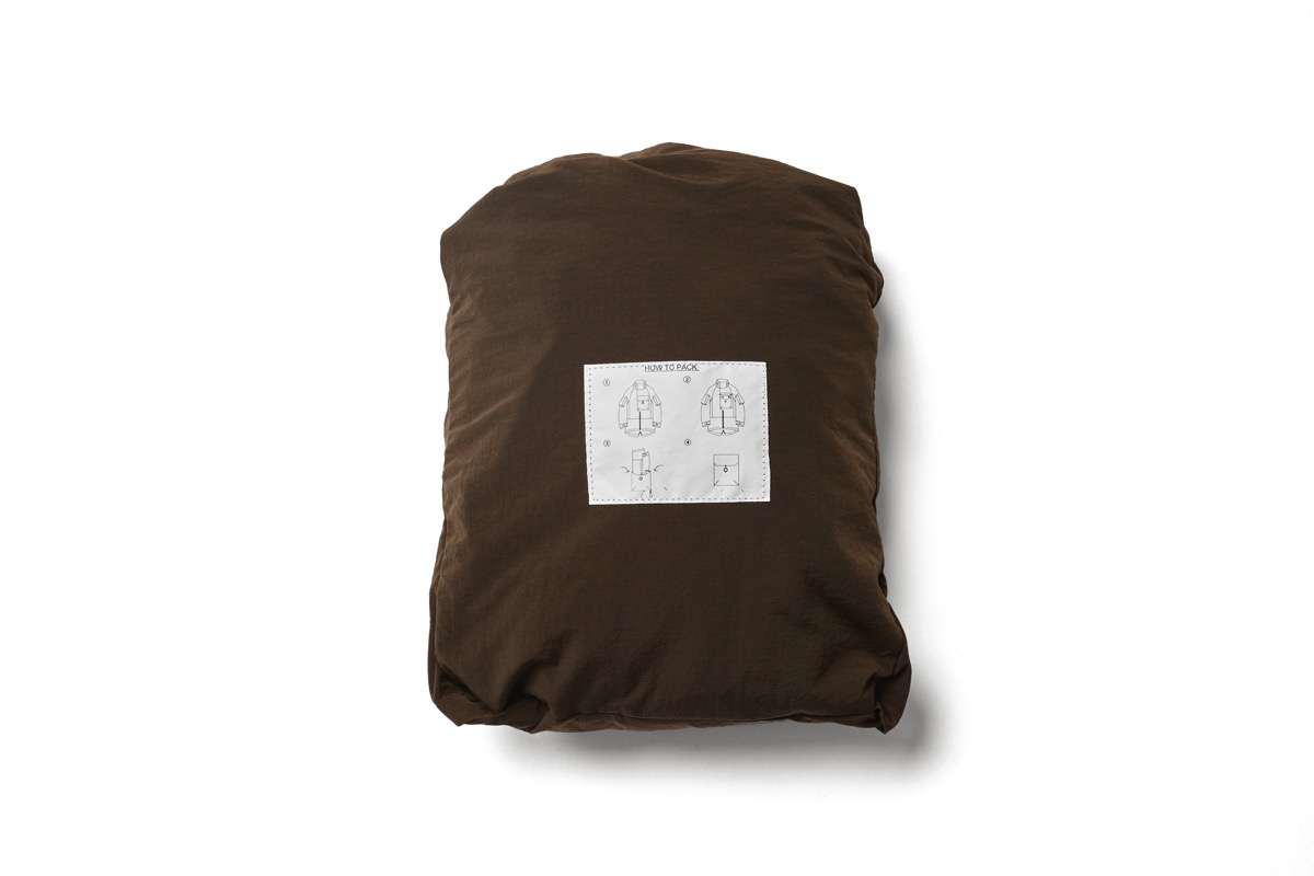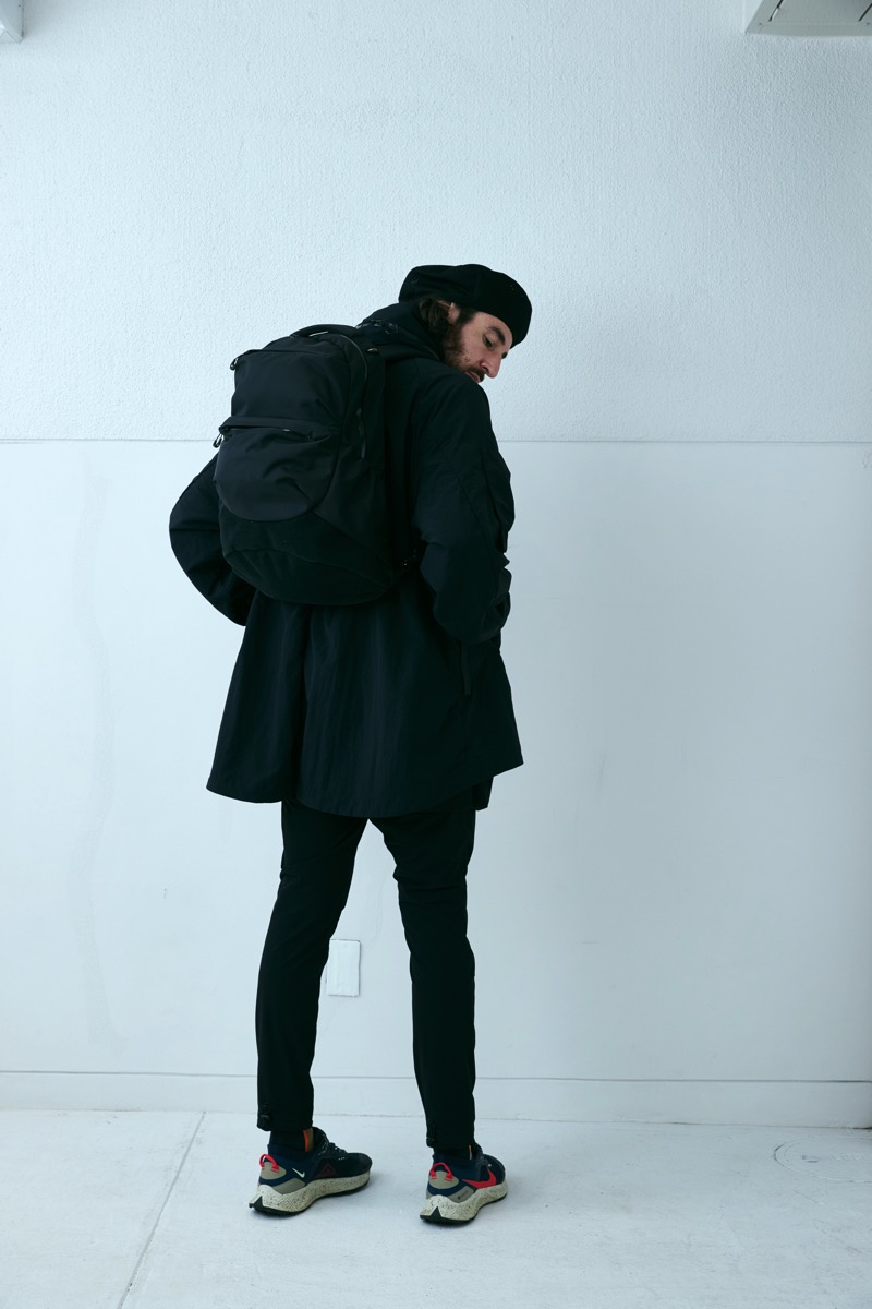 シワシワ撥水ナイロンで構成したこの型。大きい胸ポケットはサコッシュの様に使えるが、裏返してパッカブルとしても使用可能。