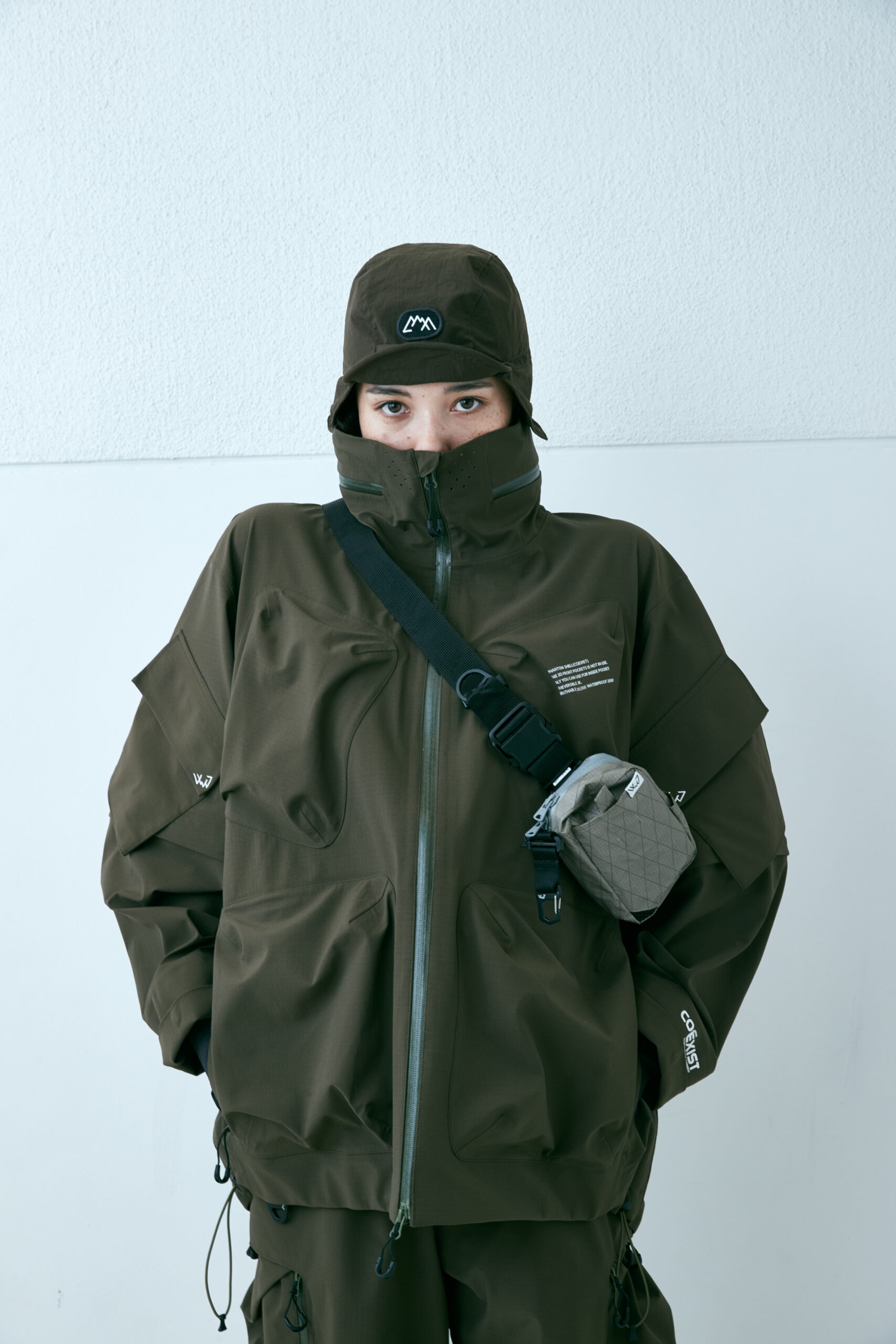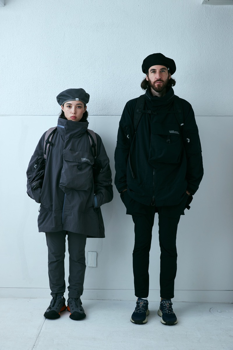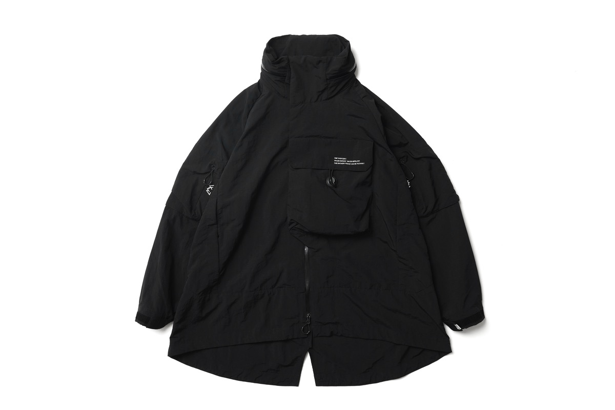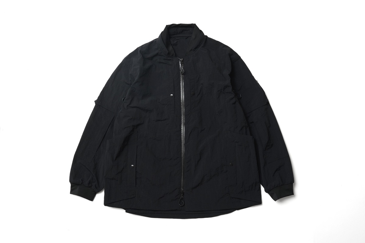 シワシワ撥水ナイロンで構成したこの型。大きい胸ポケットはサコッシュの様に使えるが、裏返してパッカブルとしても使用可能。