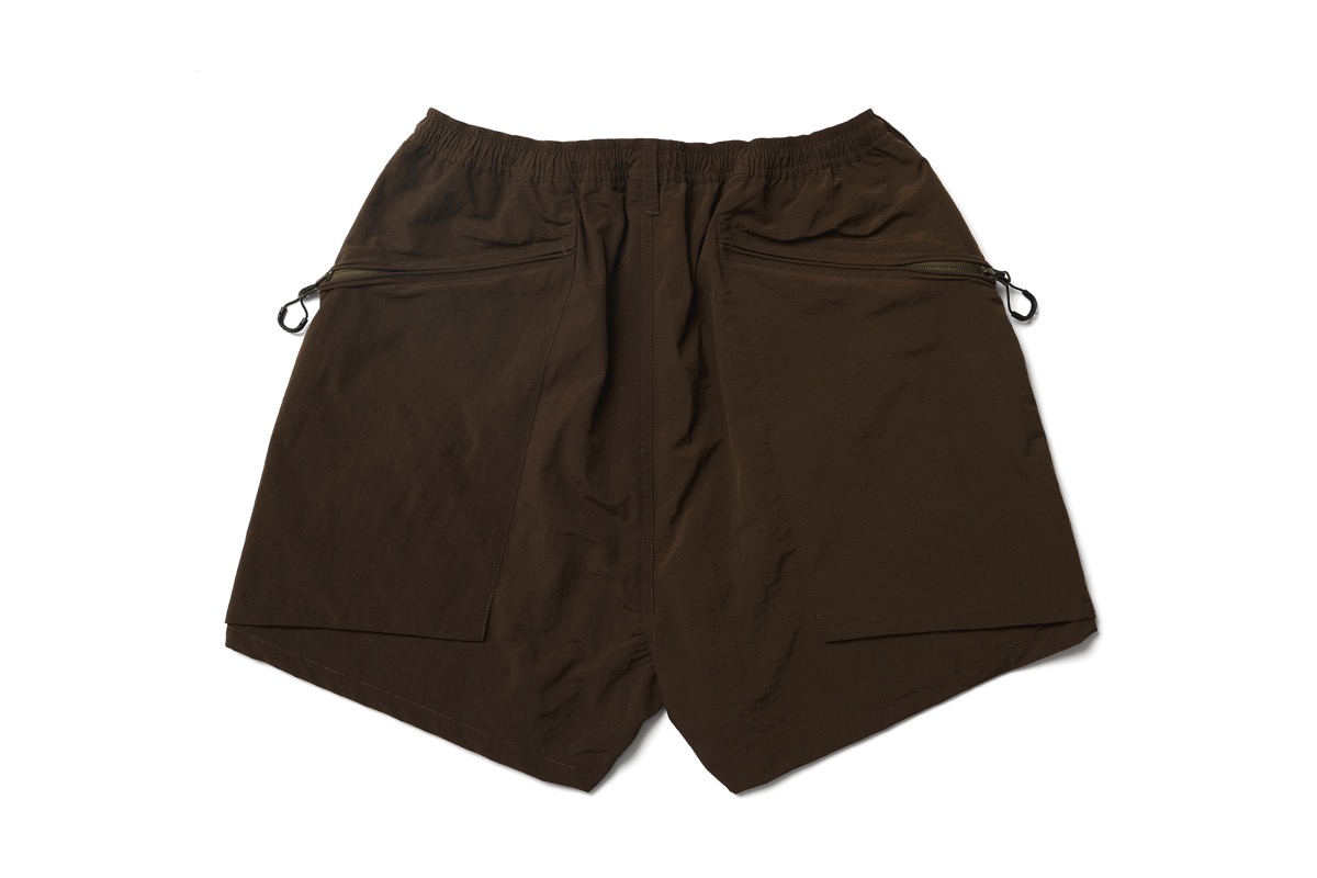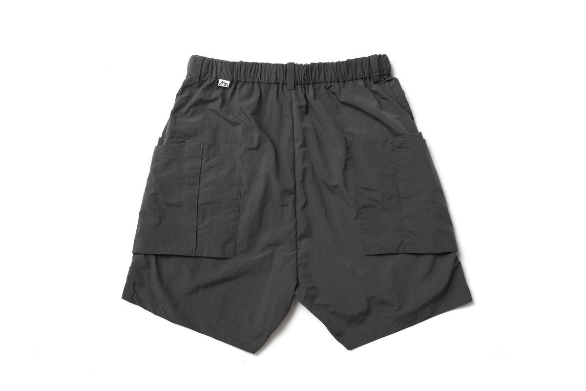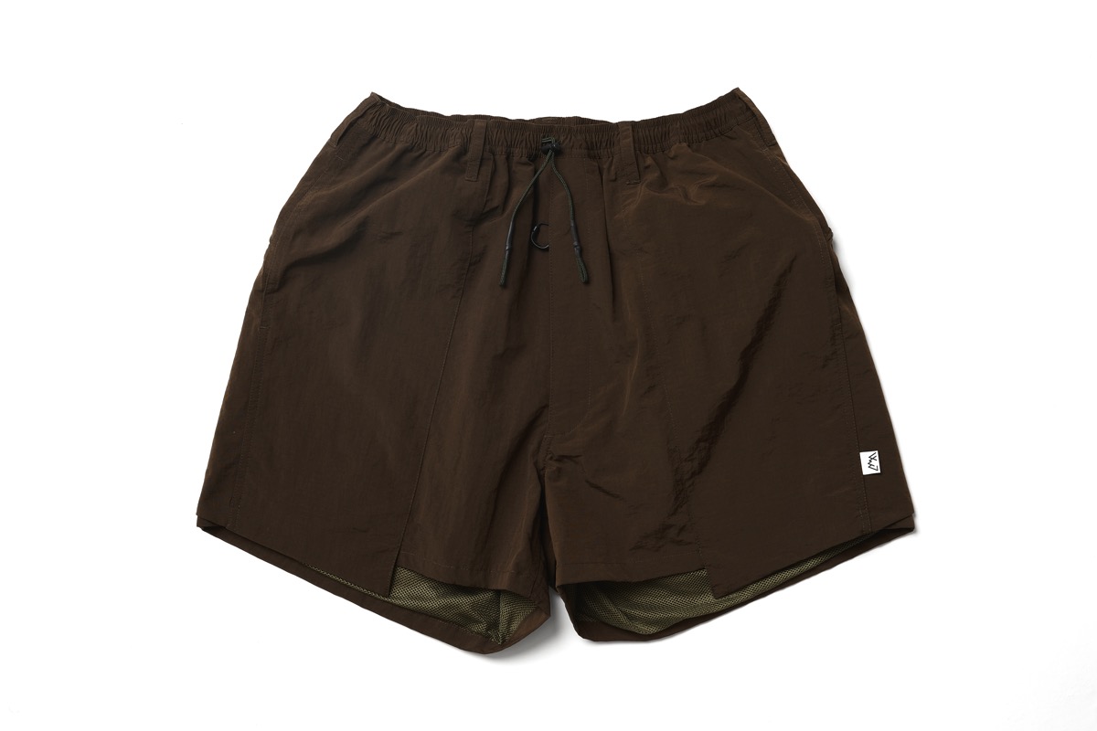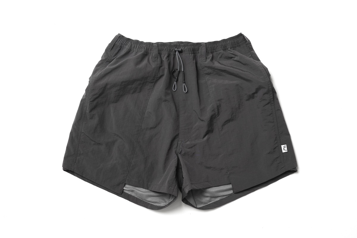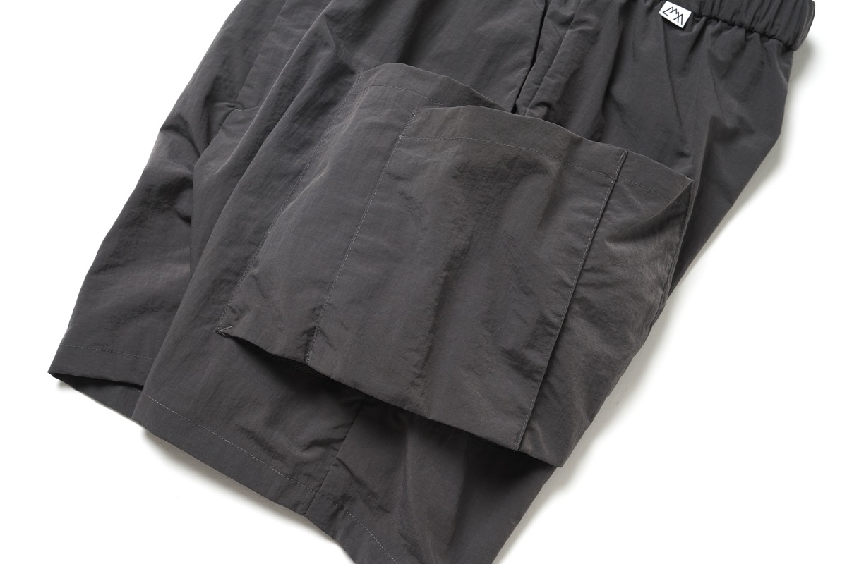 所謂バギーショーツを CMF なりに解釈し再構成したウエストはそのままに股上を深くし横幅を広げ、股下はそのままの長さに。生地は撥水塩縮加工が入ったナイロン 100 を採用した。とても軽く仕上げてありライニングはメッシュ。