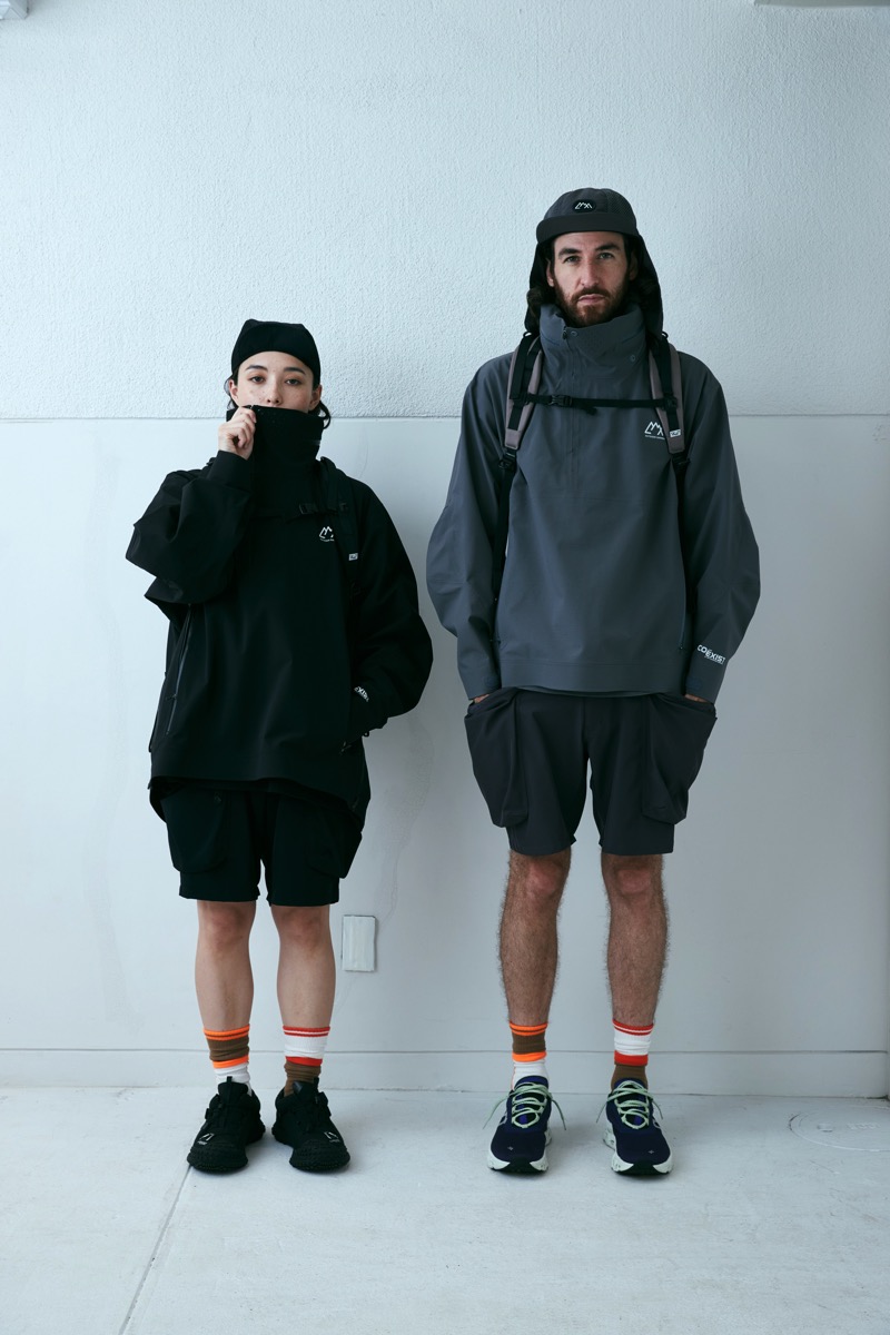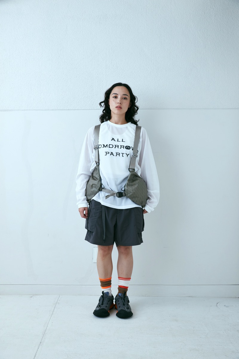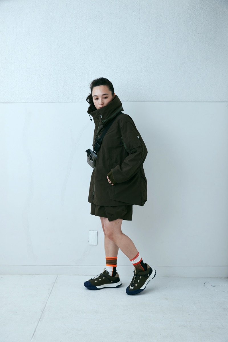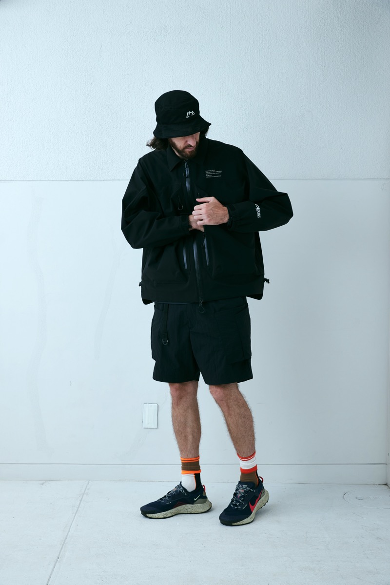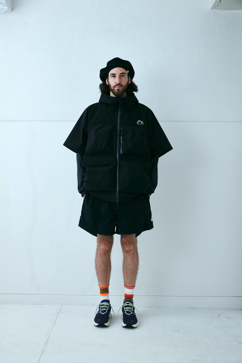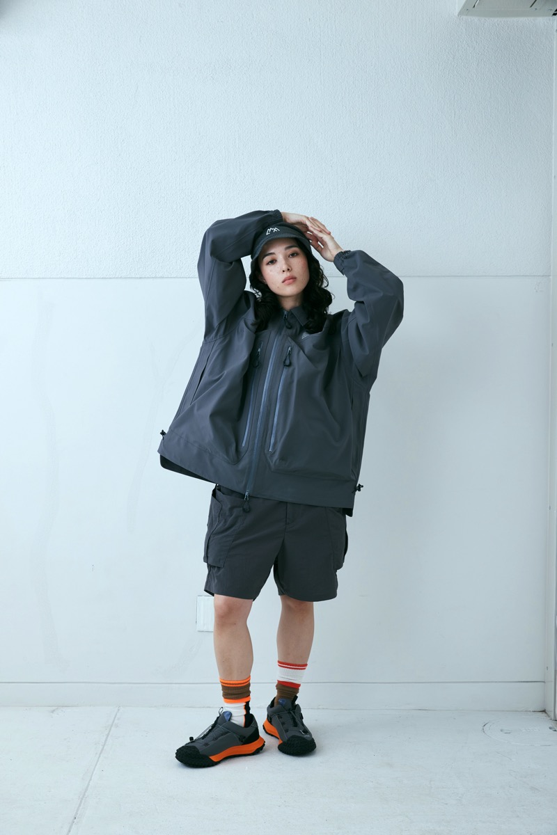 所謂バギーショーツを CMF なりに解釈し再構成したウエストはそのままに股上を深くし横幅を広げ、股下はそのままの長さに。生地は撥水塩縮加工が入ったナイロン 100 を採用した。とても軽く仕上げてありライニングはメッシュ。
